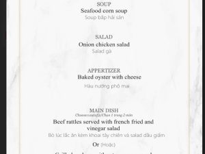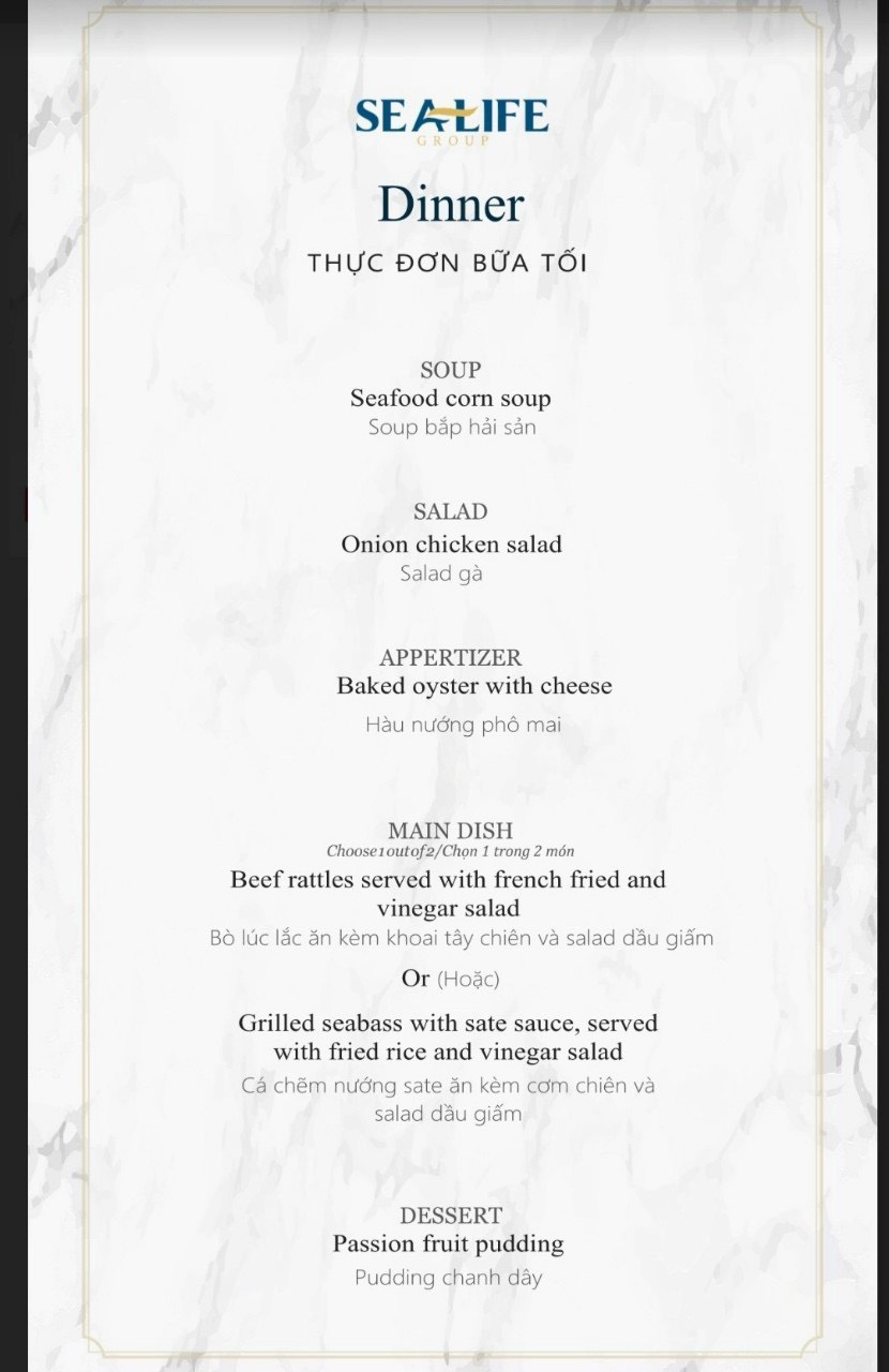 - Bữa tối đặc biệt với set menu Á 5 món, Món chính với sự lựa chọn : Bò Lúc lắc hoặc cá chẽm