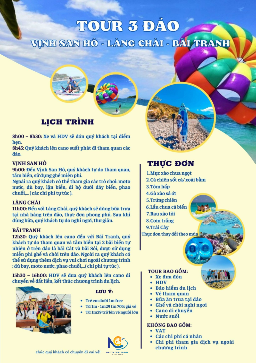 – Trẻ em từ 1 – 4 tuổi miễn phí, bố mẹ tự chăm sóc, mỗi cặp vợ chồng chỉ mang theo 01 bé, bé thứ 02 trở đi tính 50% giá tour.